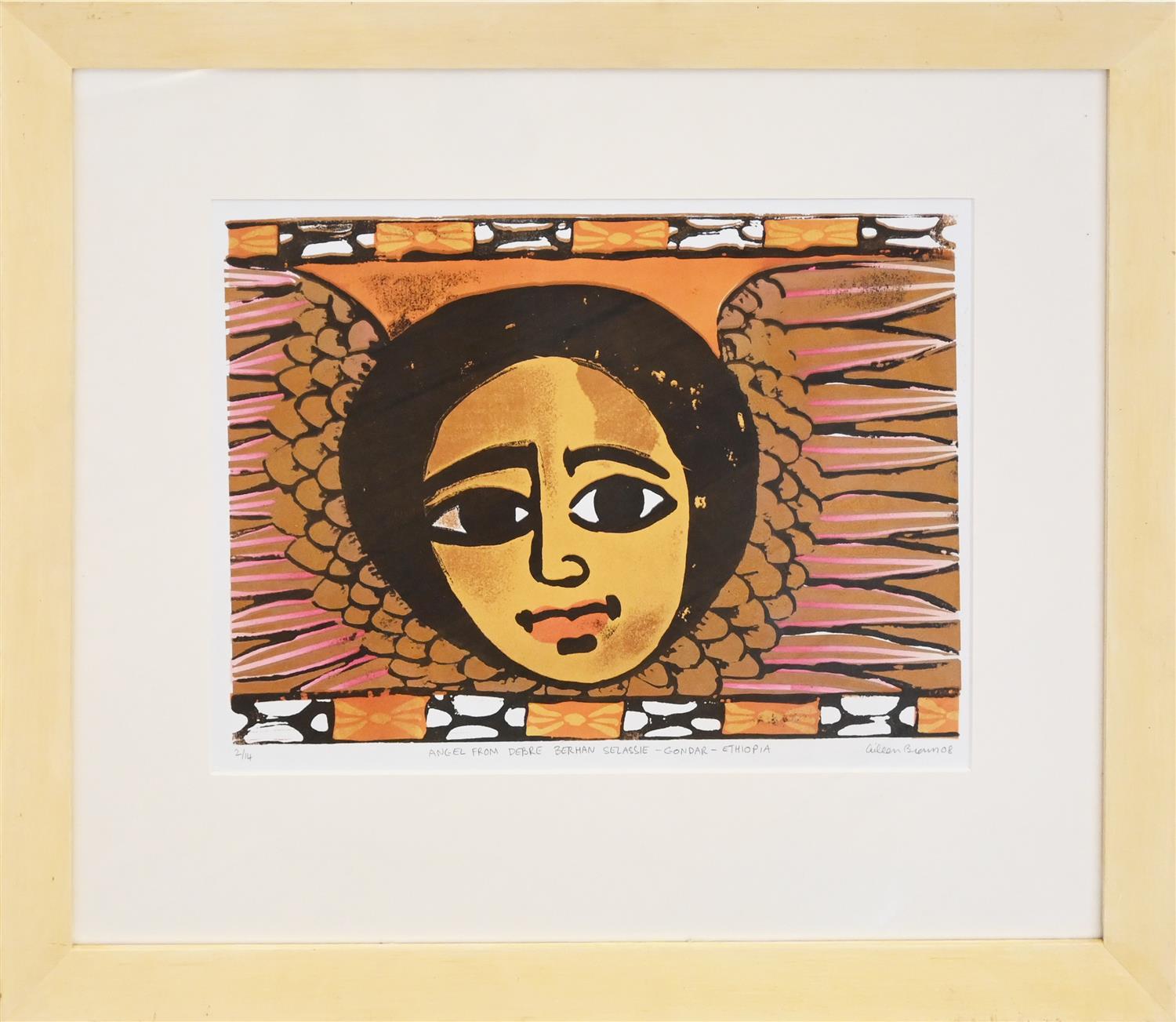 AILEEN BROWN, ANGEL FROM DEBRE BERHAM SELASSIE - GONDAR - ETHIOPIA 2008, LINOCUT AND GOLD DUST 2/14, 29 X 40CM FRAME SIZE: 57 X 66CM