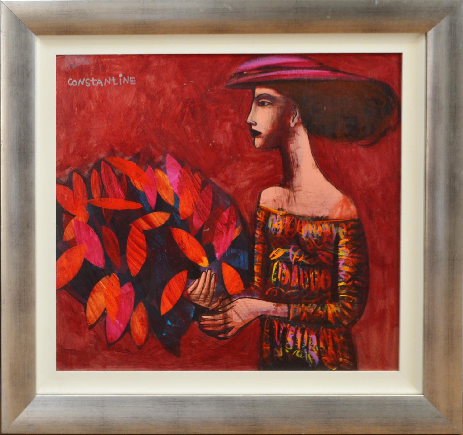 CONSTANTINE POPOV, WOMAN WITH FLOWERS, ACRYLIC ON BOARD, 56 X 59CM, FRAME SIZE: 76 X 80CM, FRAMED