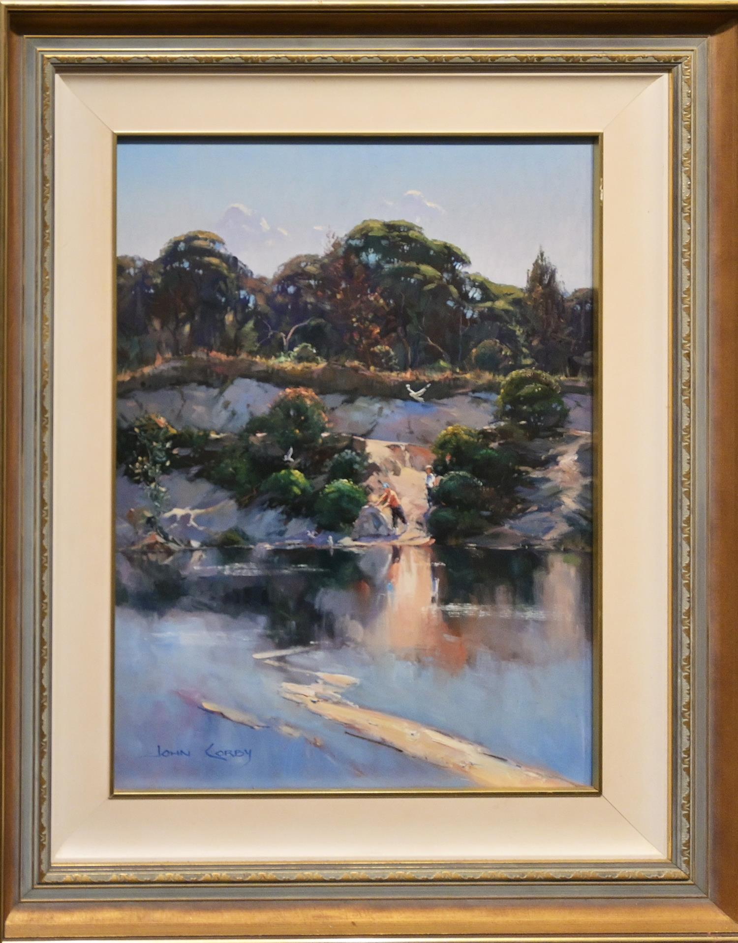 JOHN CORBY, UNTITLED (RIVER SCENE), OIL ON BOARD, 60 X 43CM