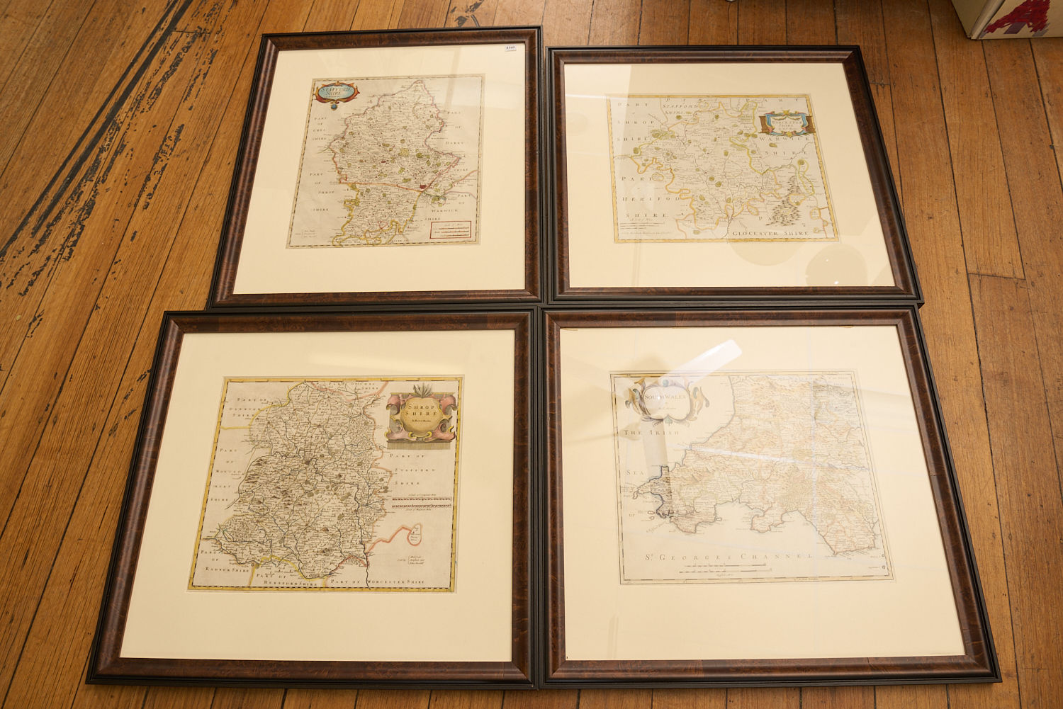 AFTER ROB MORDEN, FOUR FRAMED ENGLISH COUNTY MAPS, HAND COLOURED COPPERPLATE ENGRAVINGS H.69.5CM X W.62CM, LEONARD JOEL LOCAL DELIVERY SIZE: MEDIUM
