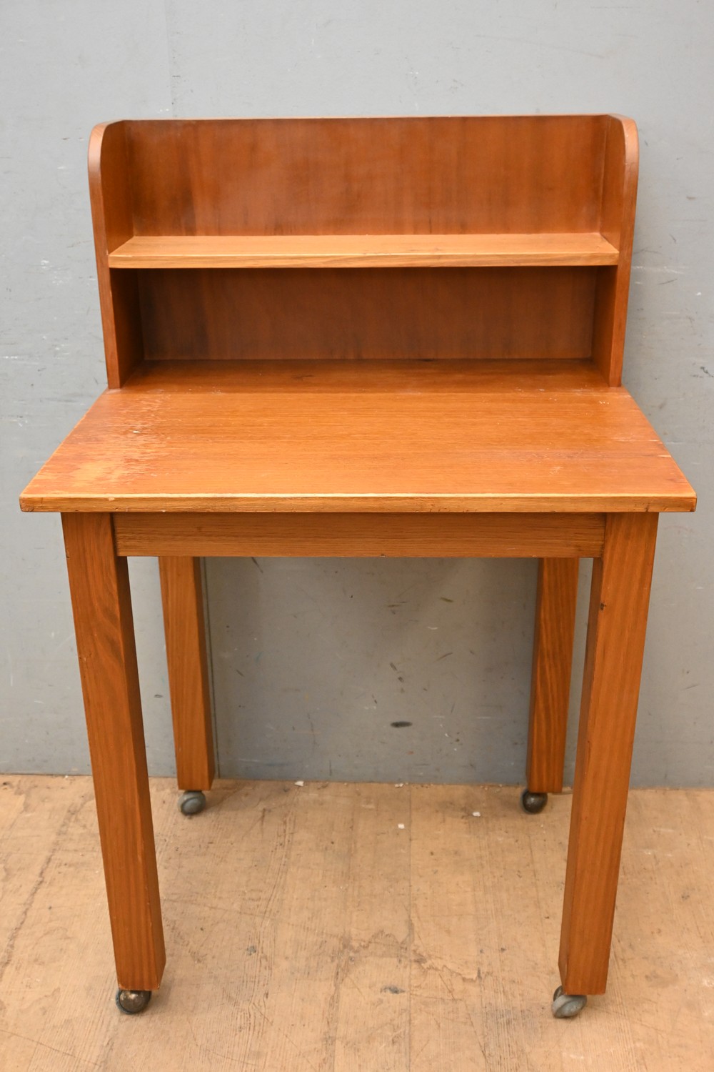 AN AUSTRALIAN OAK TWO TIER DESK ON CASTORS (A/F) (122H X 77W X 61D CM) (LEONARD JOEL DELIVERY SIZE: LARGE)