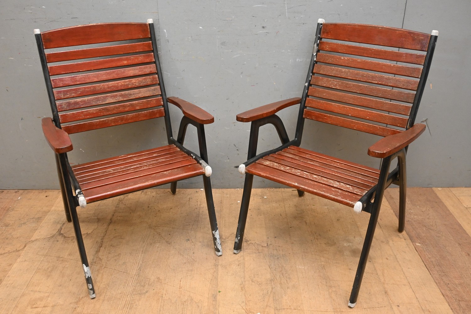 A PAIR OF AUSTRALIAN TEAK & METAL FRAMED OUTDOOR ARM CHAIRS (A/F) (90H X 60W X 63D CM) (LEONARD JOEL DELIVERY SIZE: LARGE)