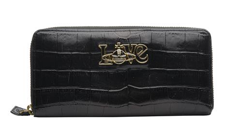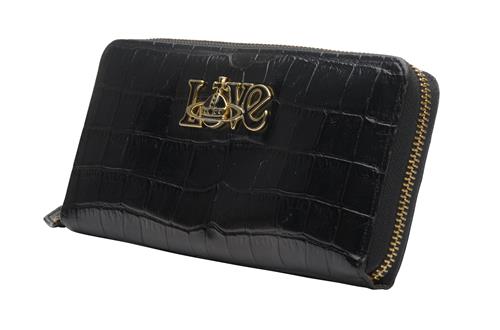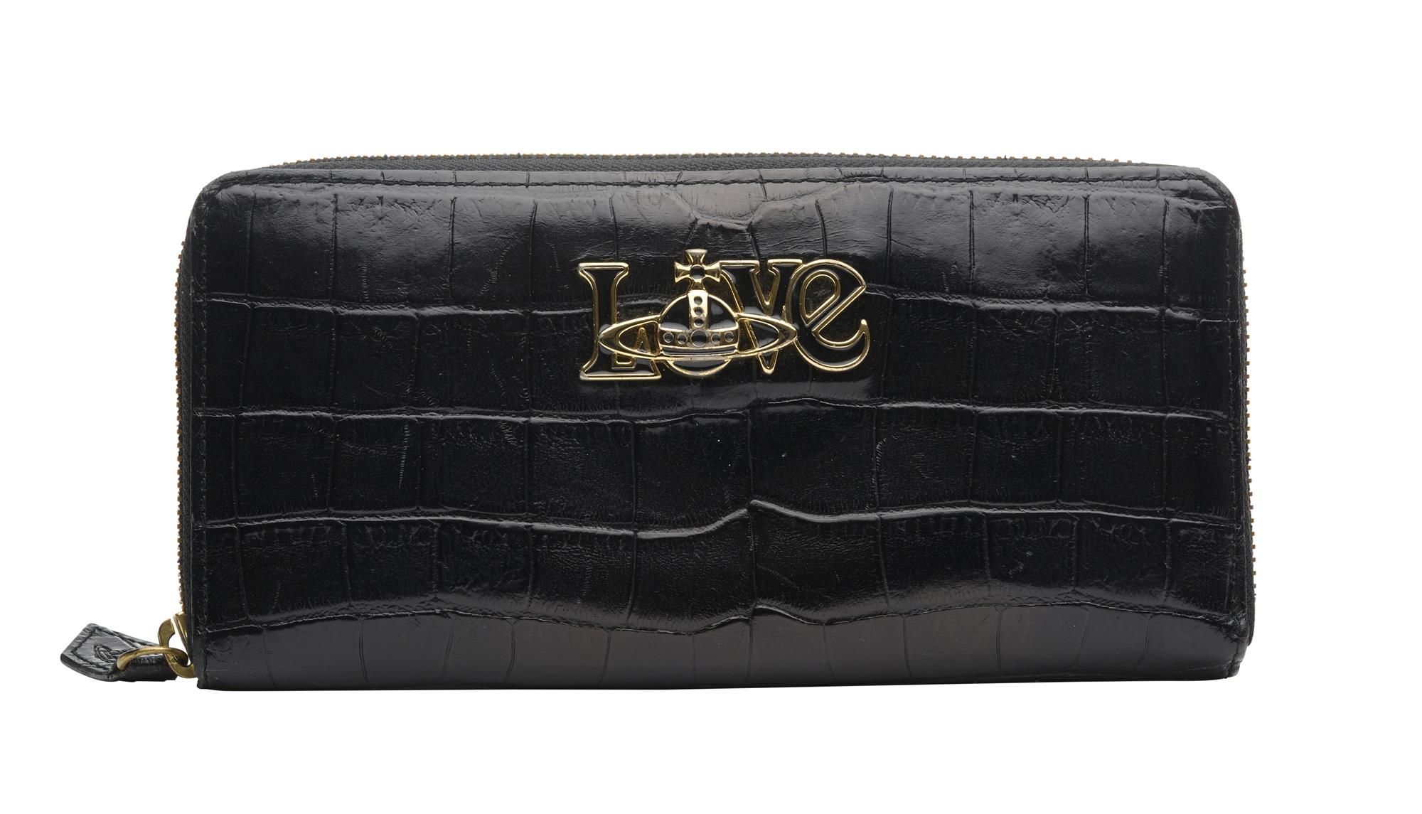 Styled in black crocodile print leather with applies black enamel and gold tone metal 'love' feature, 19 x 9 x 2cm.