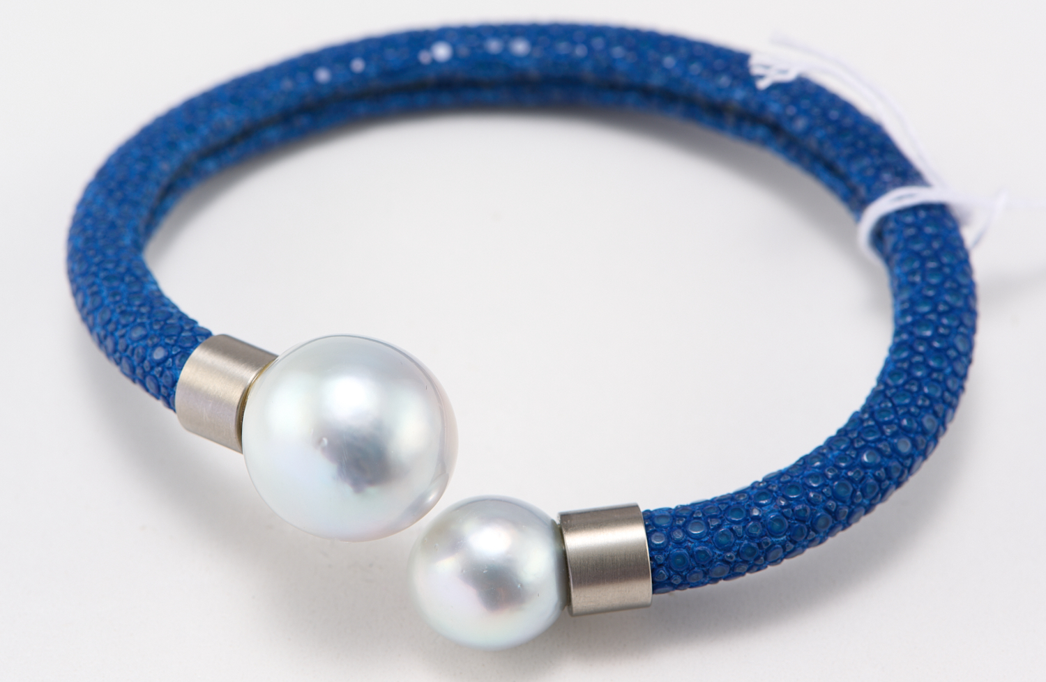 A SOUTH SEA PEARL BRACELET ON STINGRAY LEATHER WITH STAINLESS STEEL FINISH, THE PEARLS MEASURING 16.30MM AND 12.42MM