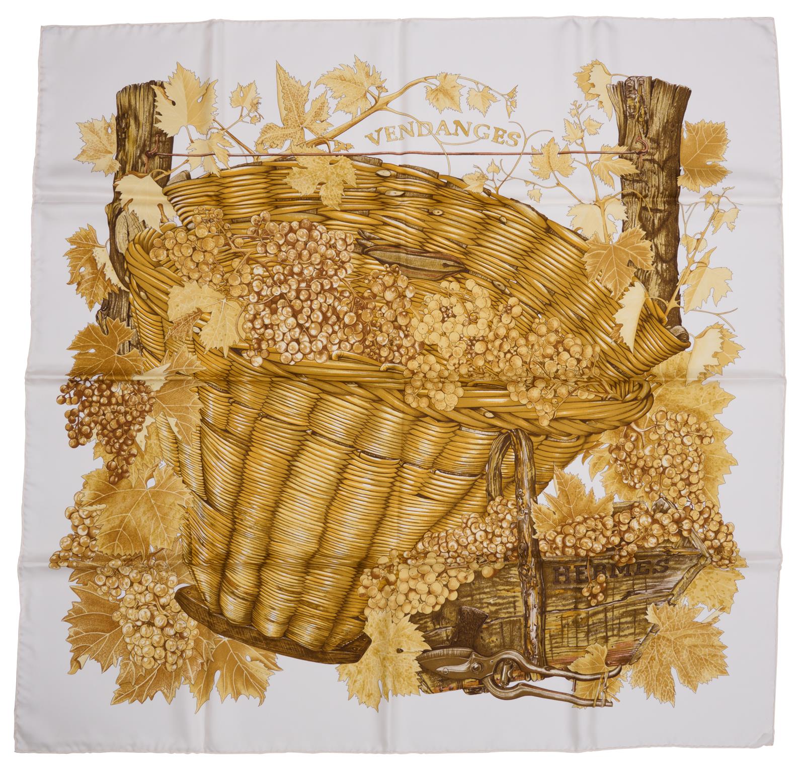 The 'Vendanges' design by Valerie Dawlat Dumoulin, styled with autumnal colours on a cream background, 90cm square, boxed.