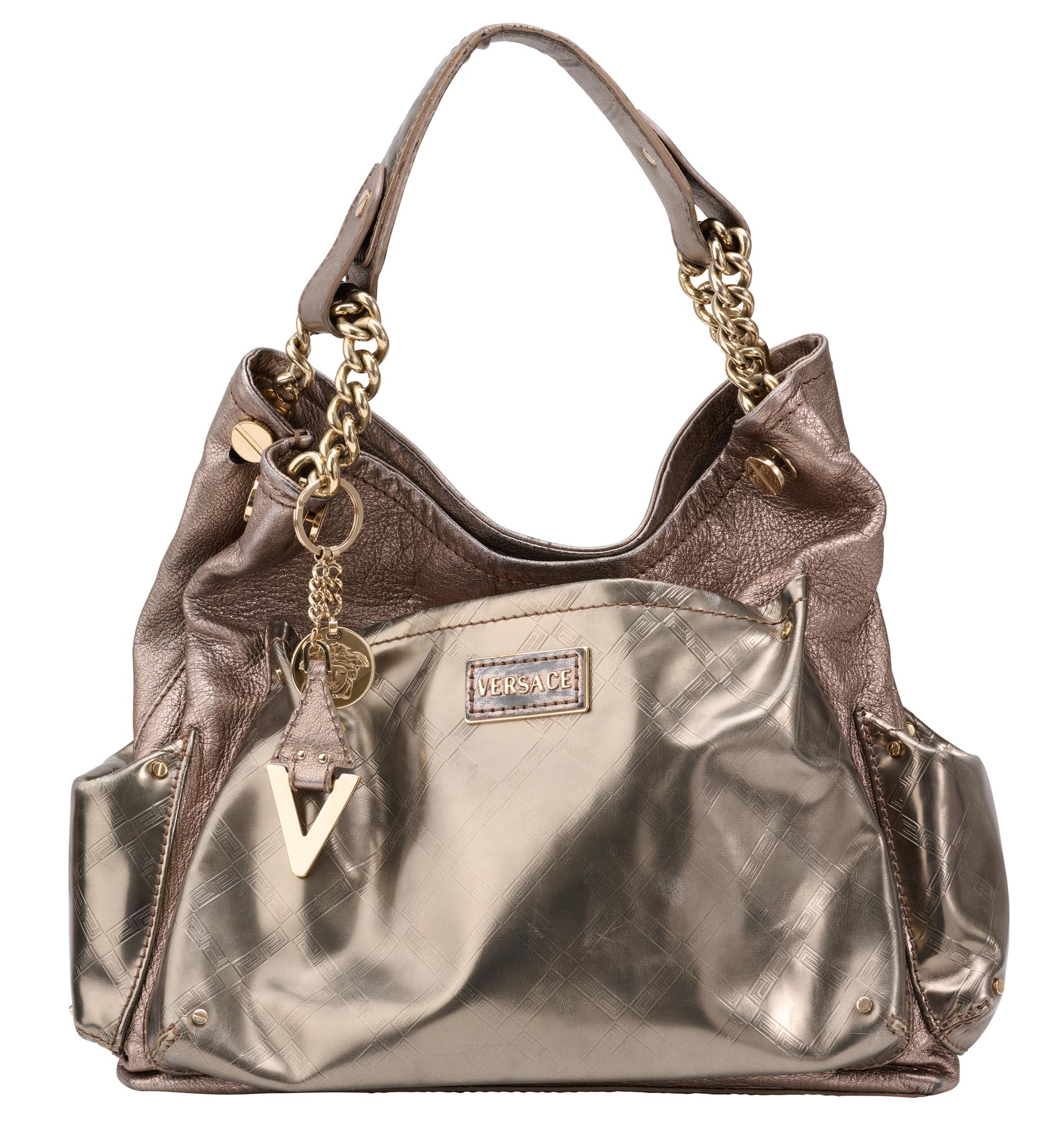 Styled in metallic silver grained leather with metallic key-pattern trim and gold tone metal hardware, 32 x 29 x 10cm.