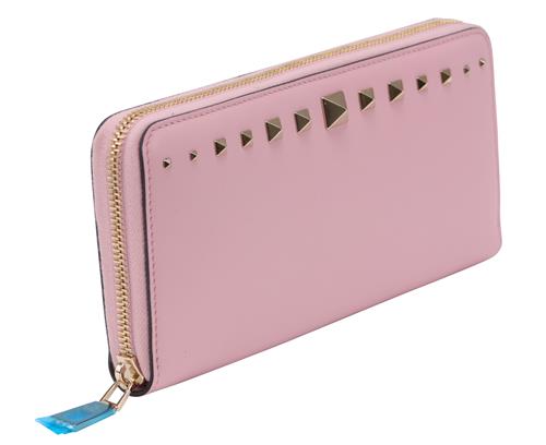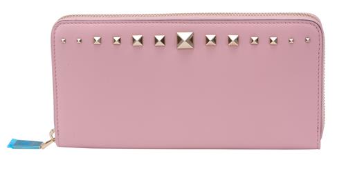 Styled in pink leather with gold tone stud feature and zipper, 19 x 10 x 2.5cm.