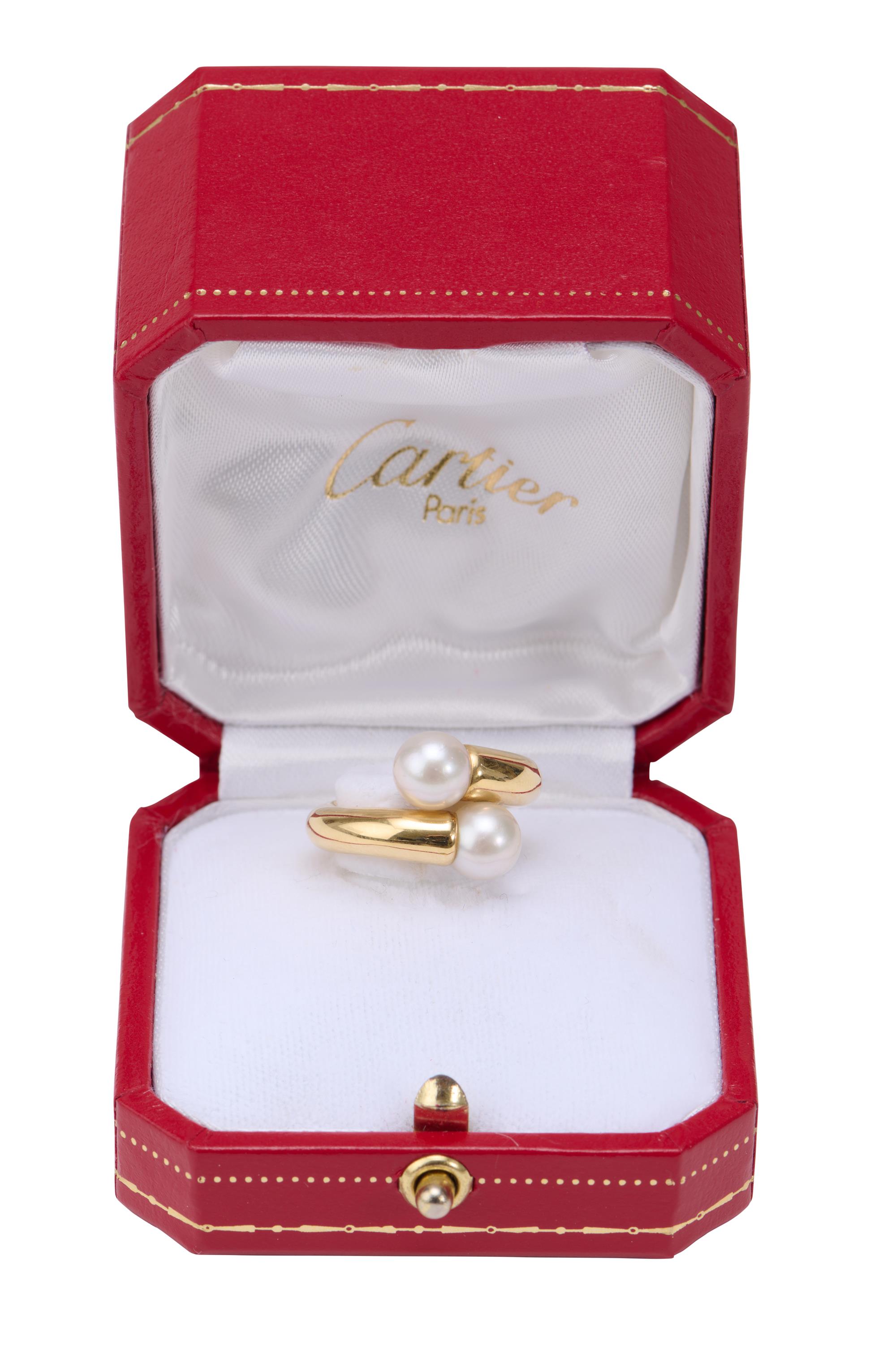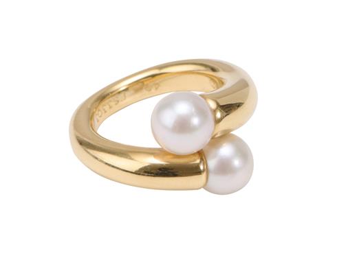 Set with two Akoya pearls in 18ct gold, F53303, 49, ring size H, boxed.