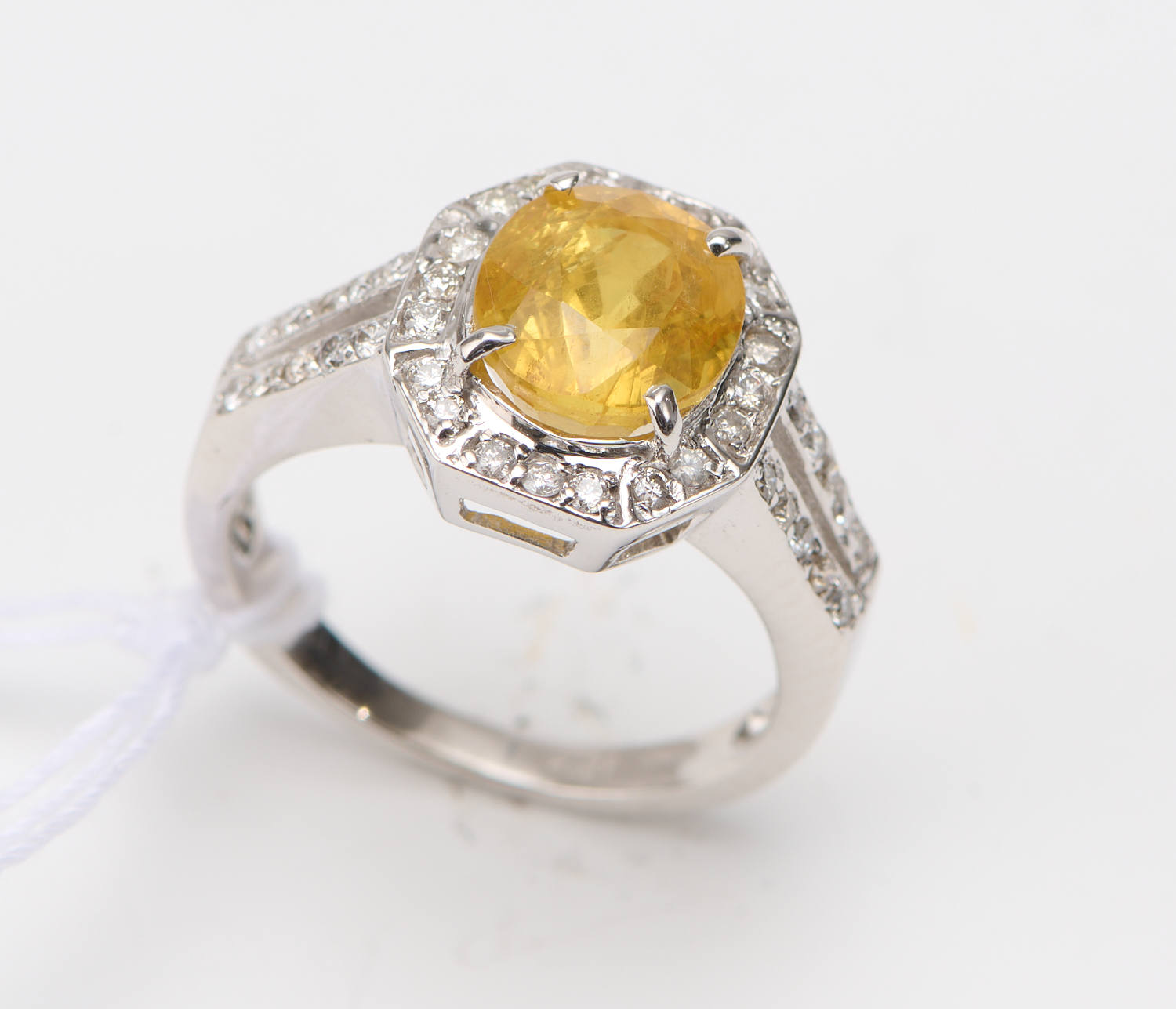 A YELLOW SAPPHIRE AND DIAMOND RING IN 18CT WHITE GOLD, THE SAPPHIRE TOTALLING 3.60CTS, THE DIAMONDS TOTALLING 0.35CTS, RING SIZE M