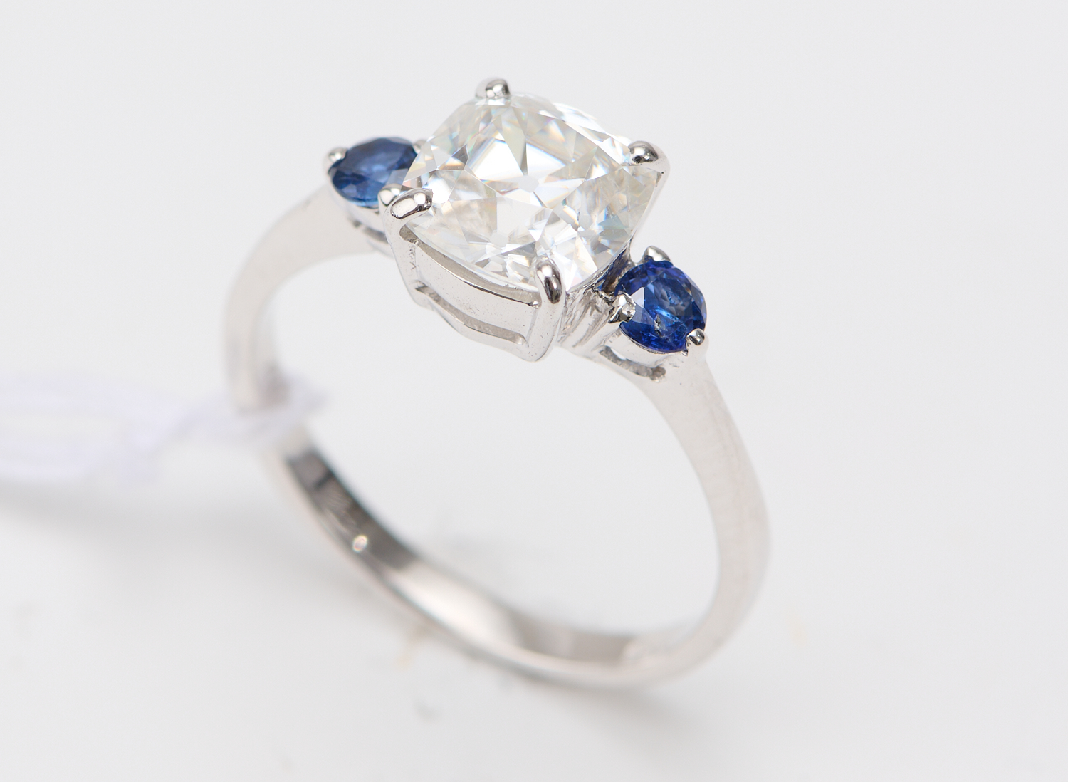 AN OLD MINE CUT MOISSANITE AND SAPPHIRE RING IN 18CT WHITE GOLD, THE MOISSANITE WEIGHING 1.88CTS, THE SAPPHIRES TOTALLING 0.20CTS, RING SIZE O 1/2, WEIGHT 3.4GMS