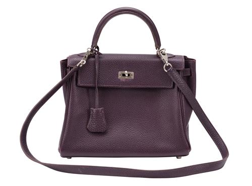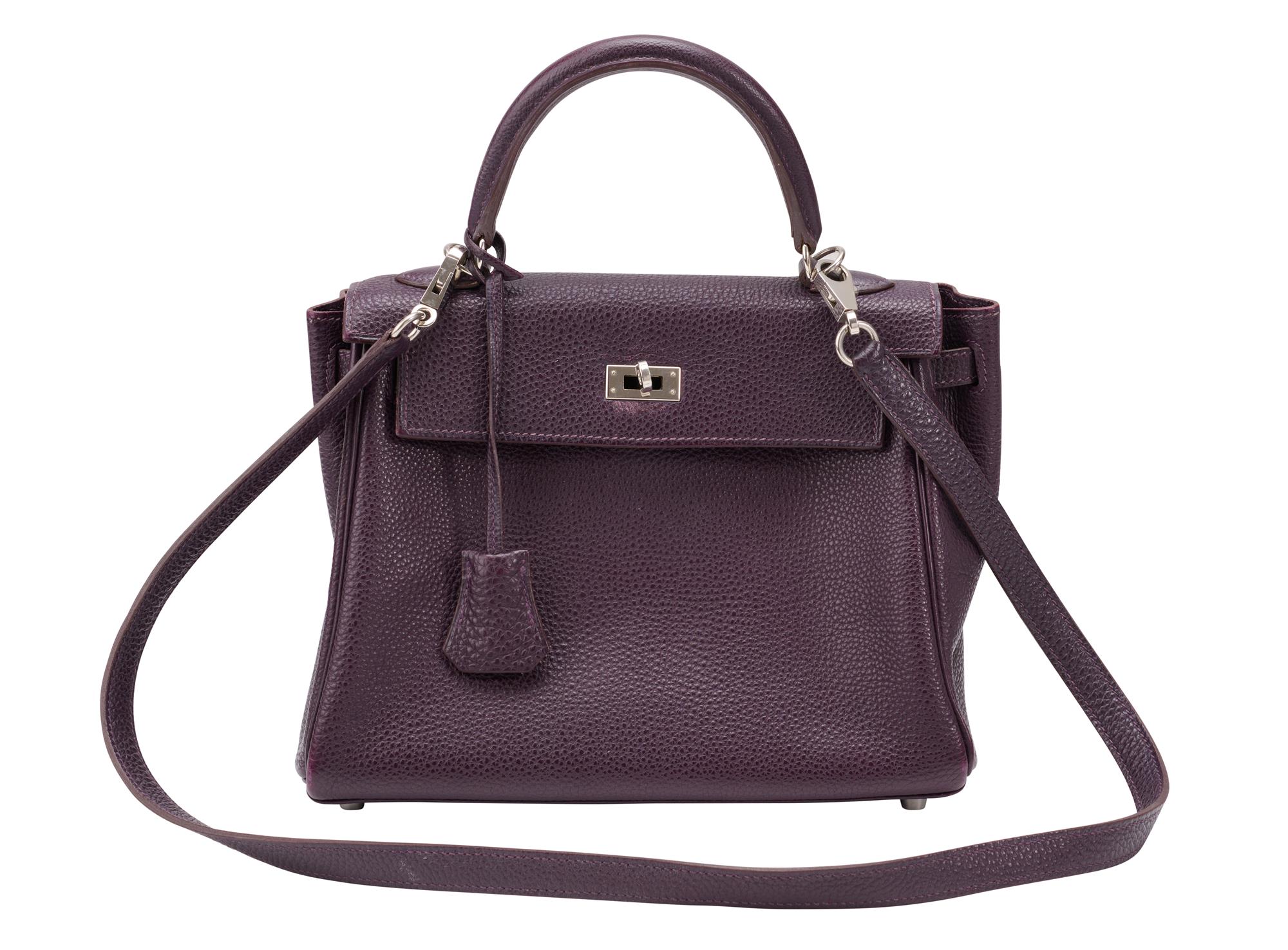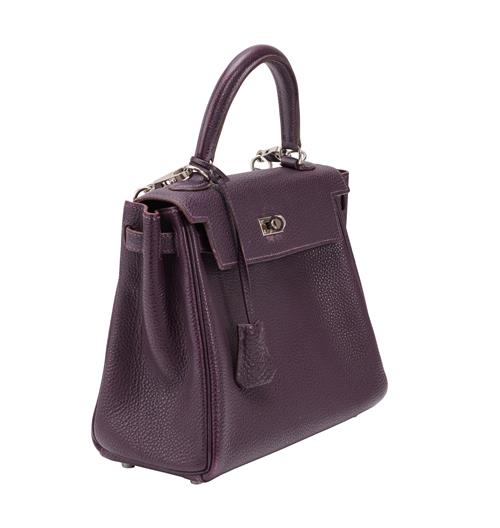 Styled in purple leather with detachable shoulder strap and silver tone metal hardware, 25 x 19 x 9cm.