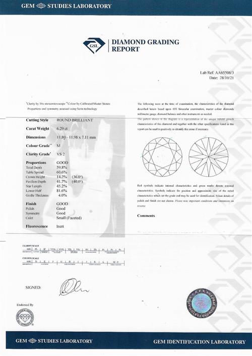Accompanied by a GSL report numbered AA65506/3, dated 28 October 2021, stating that the 6.29 carat diamond is natural, M colour, VS2 clarity.
