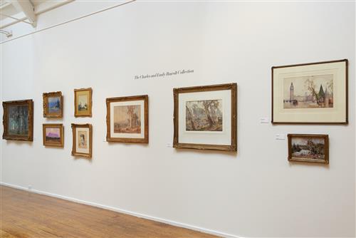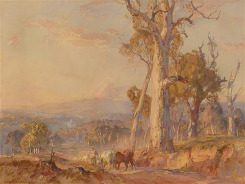 Charles and Emily Ruwolt were equally attracted to Heysen's watercolours, a medium Heysen made uniquely his own. Drover and Cattle 1917 and The River 1920 show the full range of Heysen's expressive power and his affiliation with the Australian pastoral tradition in art. In the former, a rural worker ambles down a bush track instinctively and protectively guiding a small mob of cattle - the grand old red gum is a signpost, providing a note of timelessness, while subtle natural light envelops the scene in life-affirming pink and golden hues.