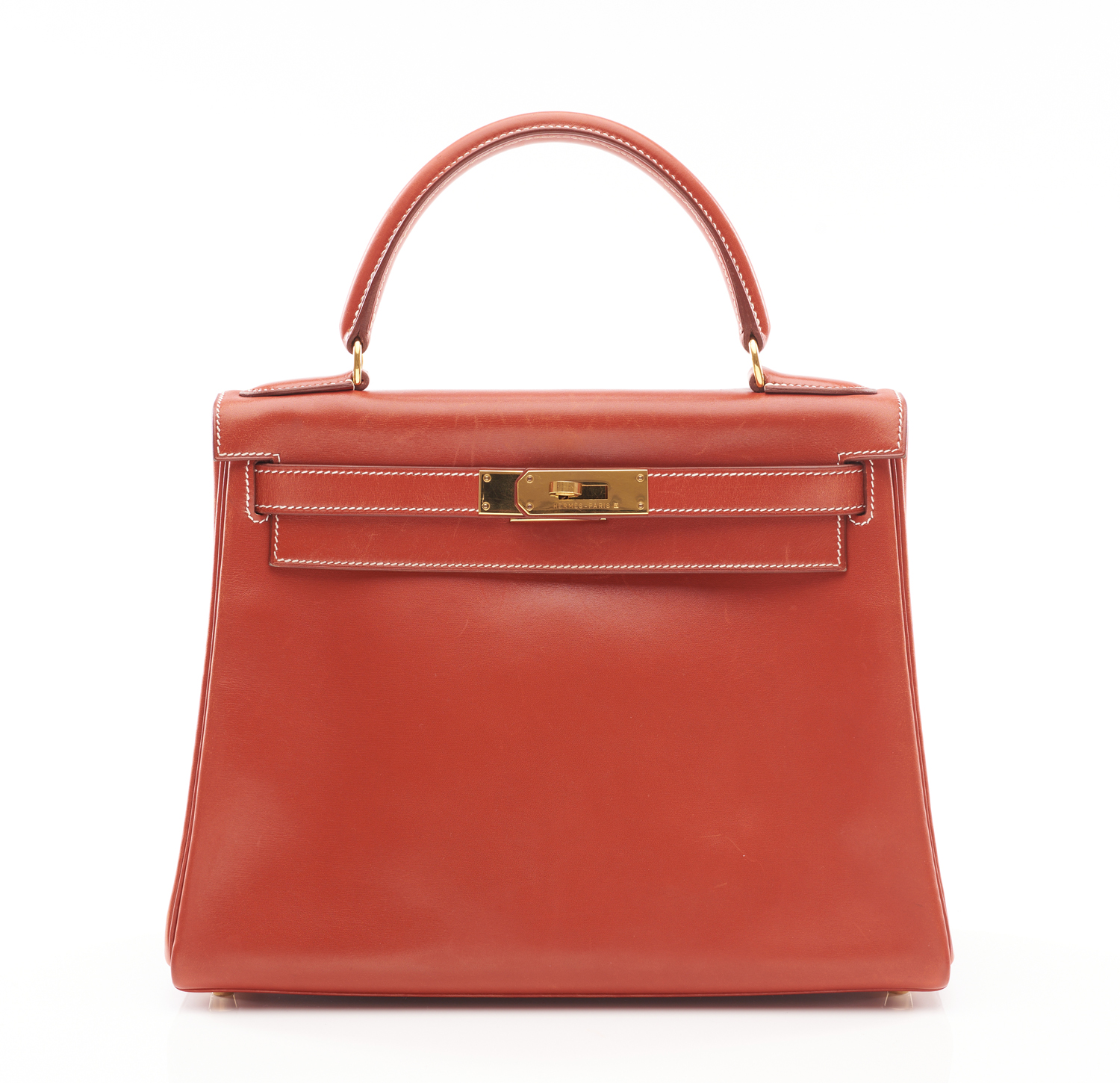 Styled in brique calfskin with detachable shoulder strap and gold tone metal hardware, 20 x 28 x 10cm.