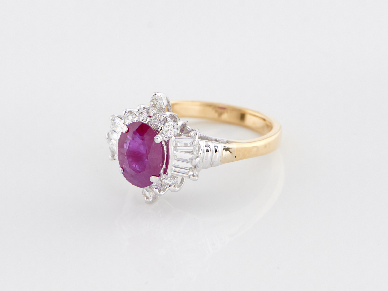 A BURMESE RUBY AND DIAMOND RING IN TWO TONE 18CT GOLD, THE RUBY WEIGHING 1.60CTS AND THE DIAMONDS TOTALLING 0.52CTS (VS-SI, F/G), RING SIZE O, ACCOMPANIED BY KLEPNER'S GEMSTONE REPORT NUMBERED 20160413/10, WITH VALUATION