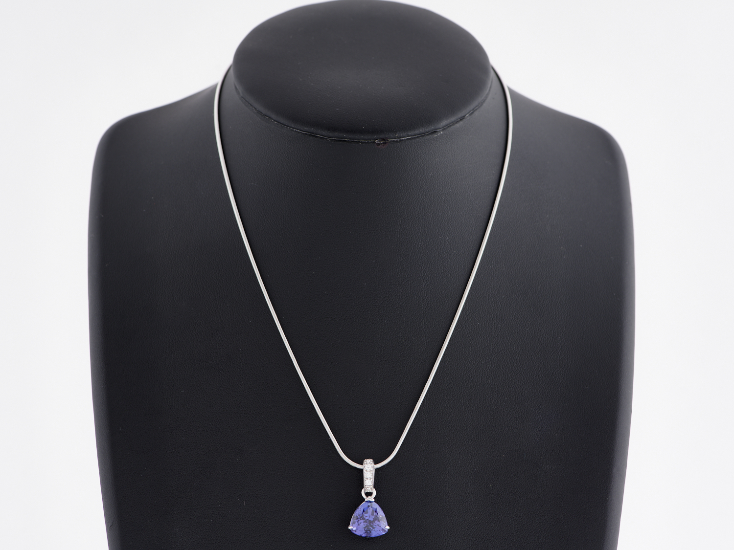 A TANZANITE AND DIAMOND PENDANT NECKLACE IN 18CT WHITE GOLD, THE TANZANITE WEIGHING 6.70CTS, LENGTH 400MM, WITH VALUATION