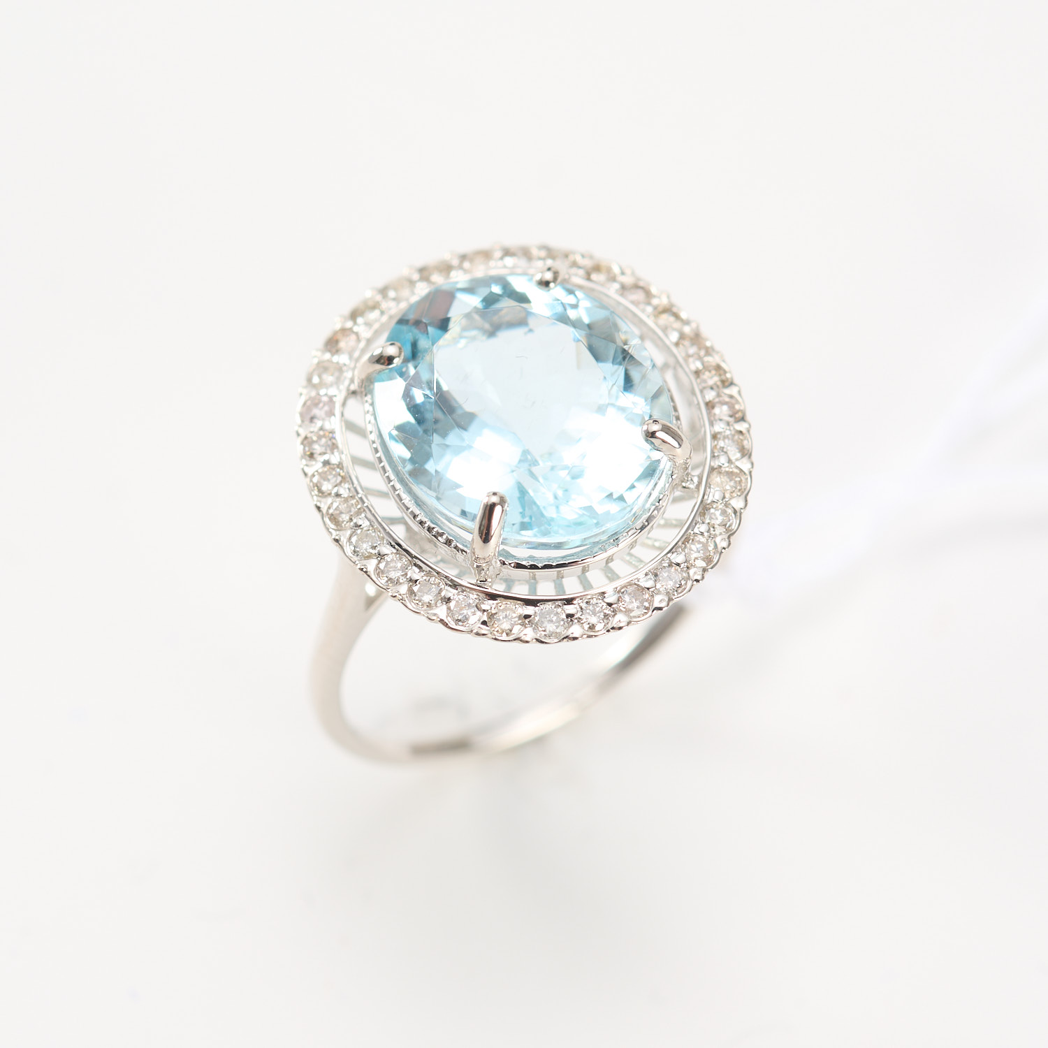AN AQUAMARINE AND DIAMOND COCKTAIL RING IN 14CT WHITE GOLD, THE AQUAMARINE TOTALLING 5.05CTS, THE DIAMONDS TOTALLING 0.29CTS, RING SIZE L