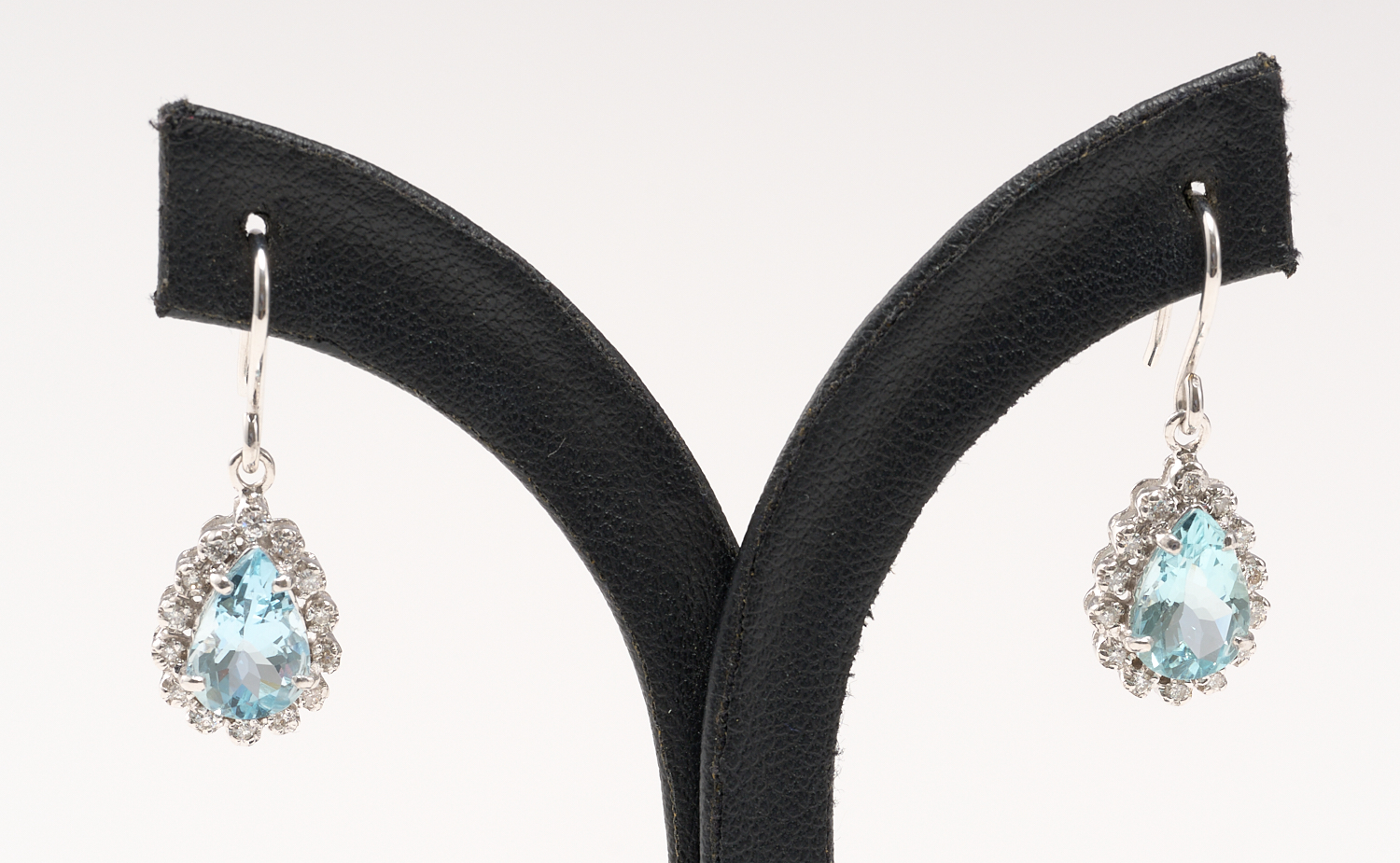 A PAIR OF AQUAMARINE AND DIAMOND EARRINGS IN 18CT WHITE GOLD TO SHEPHERDS HOOK FITTINGS, THE AQUAMARINES TOTALLINGAPPROXIMATELY 3.40CTS, THE DIAMONDS TOTALLING APPROXIMATELY 0.20CTS, LENGTH 28MM, WEIGHT 3.5GMS.