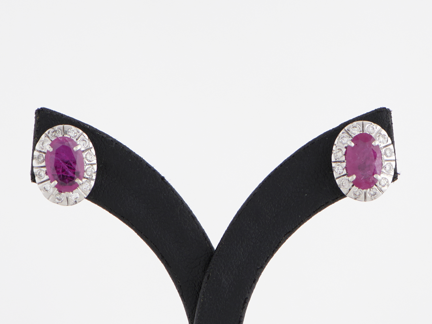 A PAIR OF RUBY AND DIAMOND EARRINGS IN 18CT WHITE GOLD TO POST AND BUTTERFLY FITTINGS, SIZE 10 X 5MM, WEIGHT 4.03GMS.