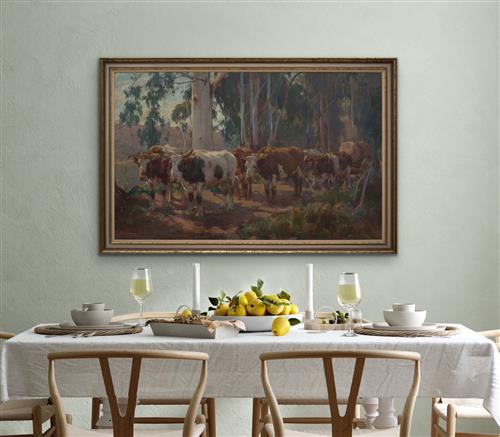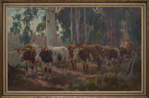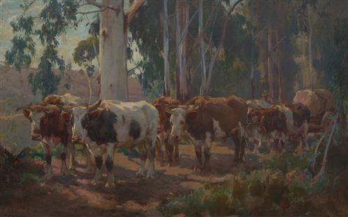 In the year 1900, Power moved to Adelaide and befriended fellow South Australian artist, Hans Heysen. Working during the week as a political cartoonist, he spent his weekends painting with Heysen in the Adelaide Hills, selling their works through a local dealer. It was during this time that he received the first commission ever given by the National Gallery of South Australia to an Australian artist (2). It was for an animal painting titled After the Day's Toil 1903, hung in the Gallery in August 1904.