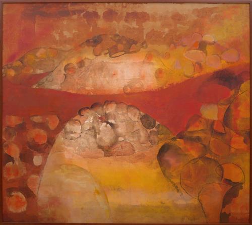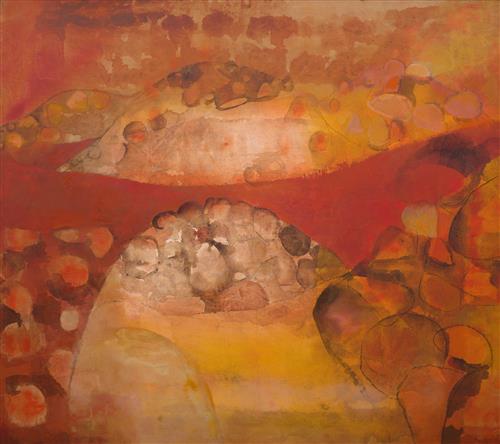 "Red Desert 1972 oscillates between an aerial 'bird's-eye-view' of the landscape which is dissected by the flat red river, and alternatively a conventional pictorial perspective, a landscape where the two centrally curved shapes represent the crests of hills separated by the red shadow of the valley between." (excerpt, p. 32)