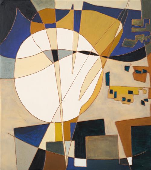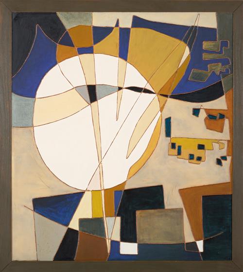 The upper left corner bears a significant break in board. This has been supported by extra composition board attached verso. Hairline cracks seen in some areas of the white enamel. The remainder of the work is in good condition, consistent with age. Overall frame measuring 150 x 134.5cm.