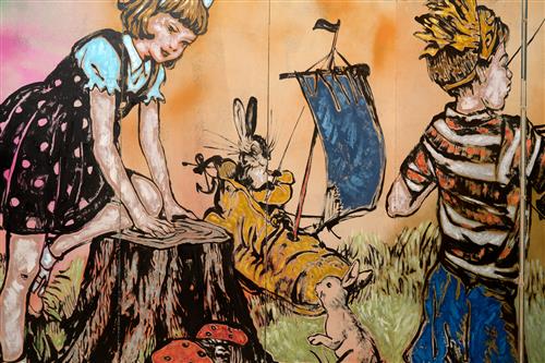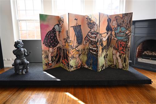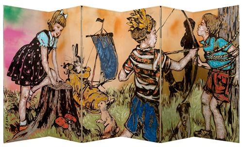 synthetic polymer paint and aerosol on repurposed Japanese folding screen