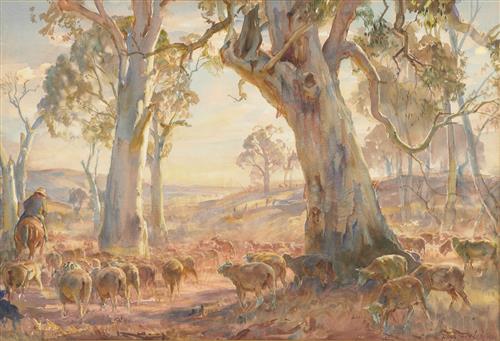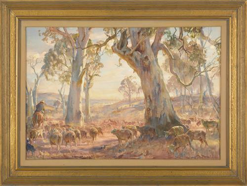 He depicts here the drover and his faithful dog, guiding the flock to their destination with the surrounding countryside bathed in the most wonderful light and atmosphere. His dedication as to the visual capture of this landscape subject demands to be recorded, interpreted and celebrated as an integral part of our nation's history. Possibly his finest depiction of this favoured subject is 'Droving into the light' (1914-21) in the collection of the Art Gallery of Western Australia, now recognised as one of our greatest federation pictures.