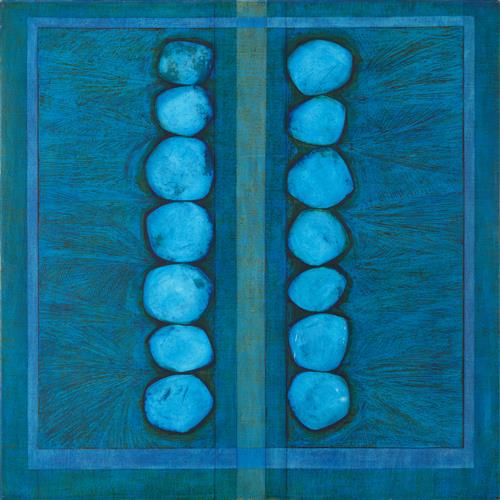 Minor cracking starting to appear in the black pigment around the edges of the circular forms. Abrasions seen to the paint surface in the lower right forms. This work is stretched with no additional framing.