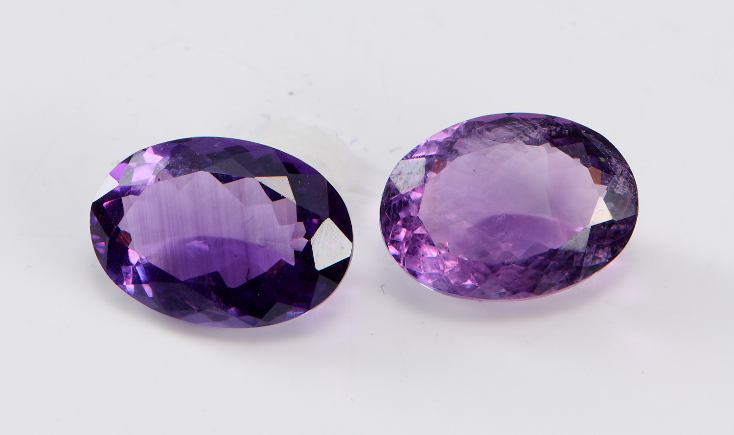A PAIR OF LOOSE OVAL CUT AMETHYSTS, 13.99MM X 9.92MM X 5.91MM AND 13.55MM X 10.56MM X 8.65MM, TOTAL WEIGHT 10.30CTS