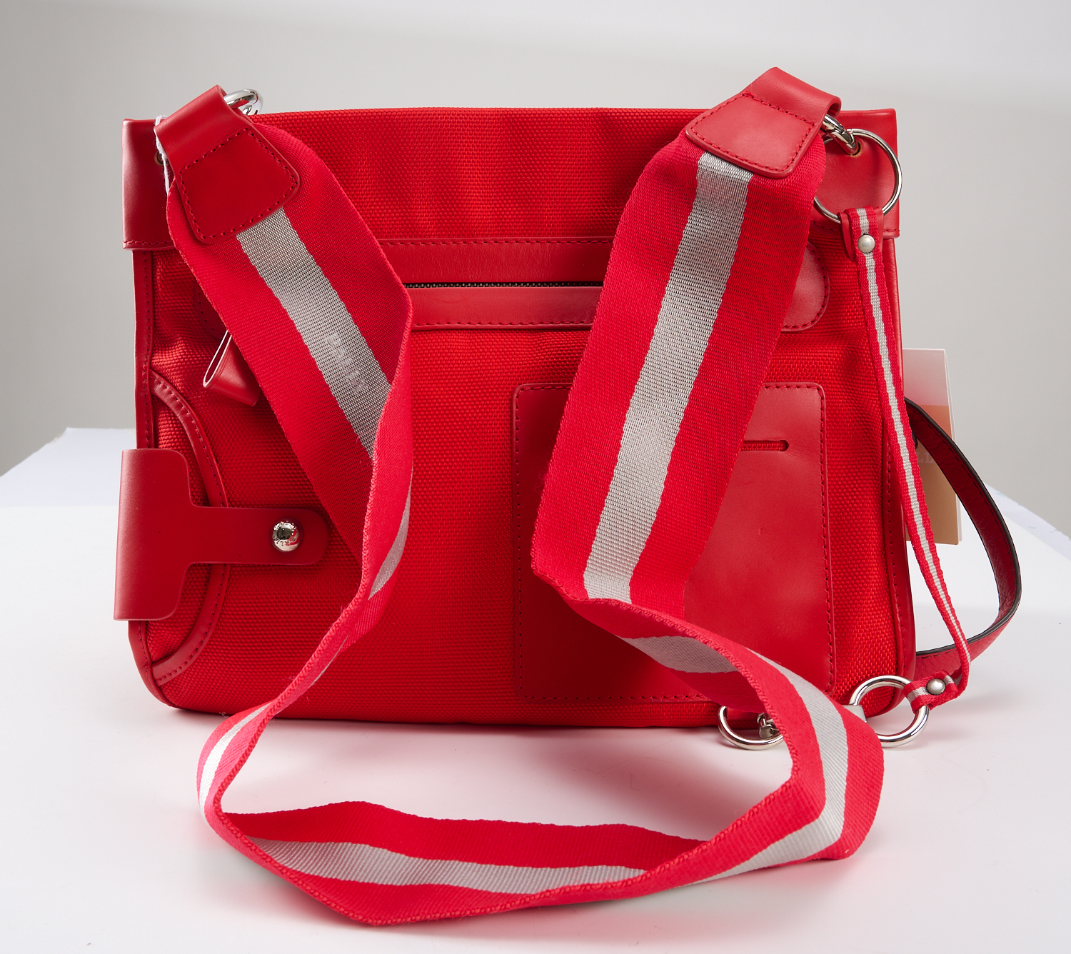A SHOULDER BAG BY BALLY - Styled in red canvas, with grosgrain shoulder strap and red leather trim, 30.5 x 25 x 2cm.