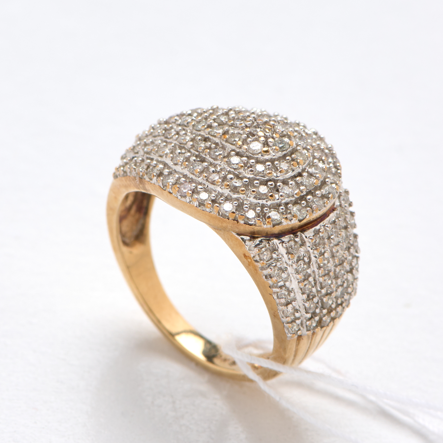 A DIAMOND CLUSTER RING IN 9CT GOLD, SET WITH 108 BRILLIANT CUT DIAMONDS TOTALLING APPROXIMATELY 1.0CT, RING SIZE P, WITH VALUATION, 8.8GMS