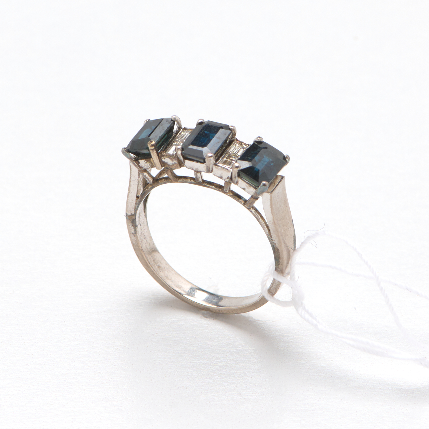 A THREE STONE SAPPHIRE AND DIAMOND RING IN 18CT WHITE GOLD, RING SIZE M, 3.7GMS