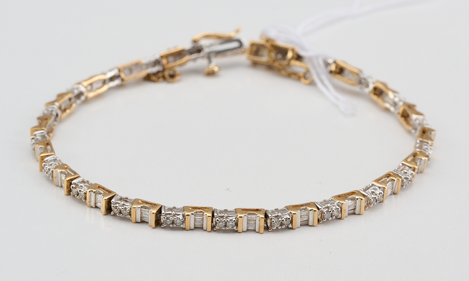 A TWO TONE DIAMOND LINE BRACELET IN 14CT GOLD, WITH SAFETY CHAIN, TOTAL LENGTH APPROXIMATELY 179MM, 11.9GMS