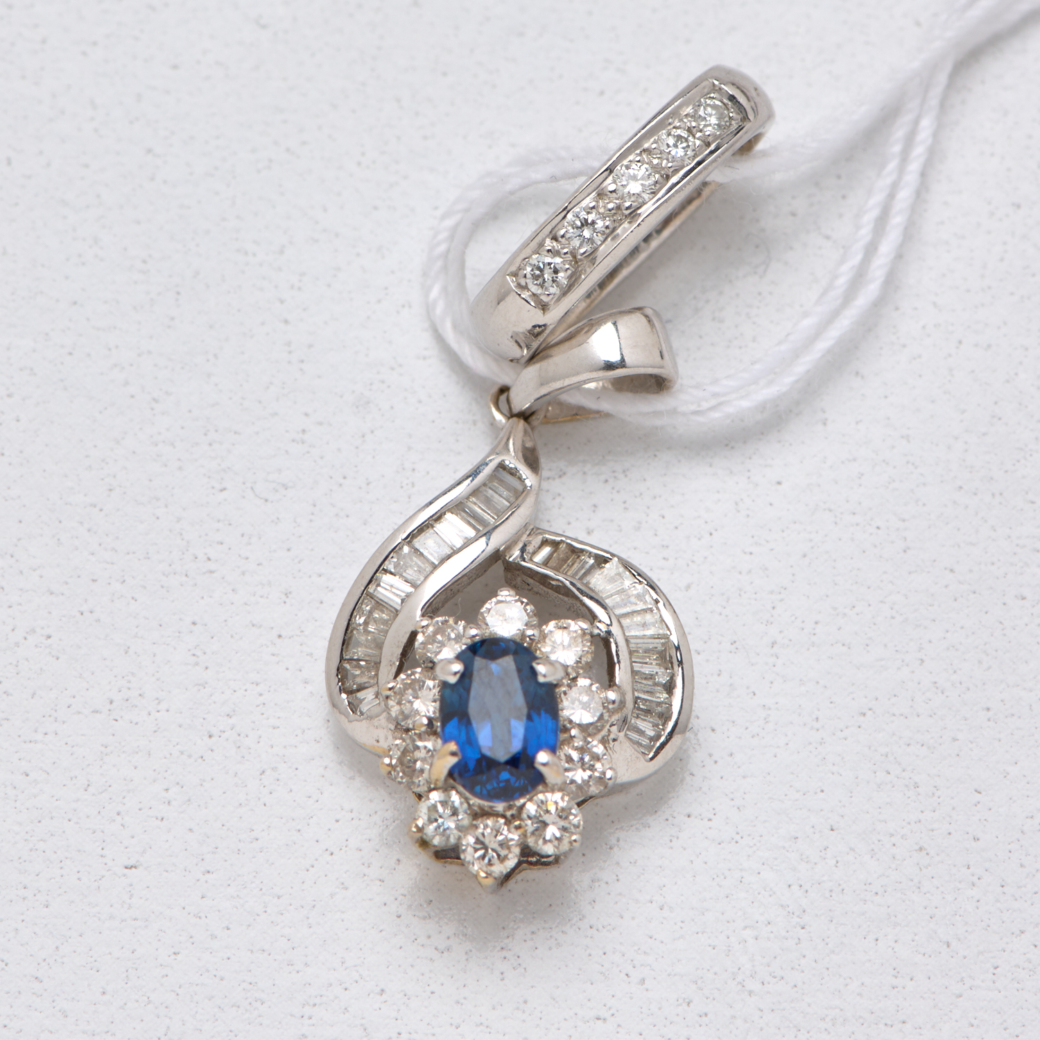 TWO PENDANTS IN 18CT WHITE GOLD, ONE SAPPHIRE AND DIAMOND SET (22MM X 12MM), ONE DIAMOND SET (12MM), 3.9GMS