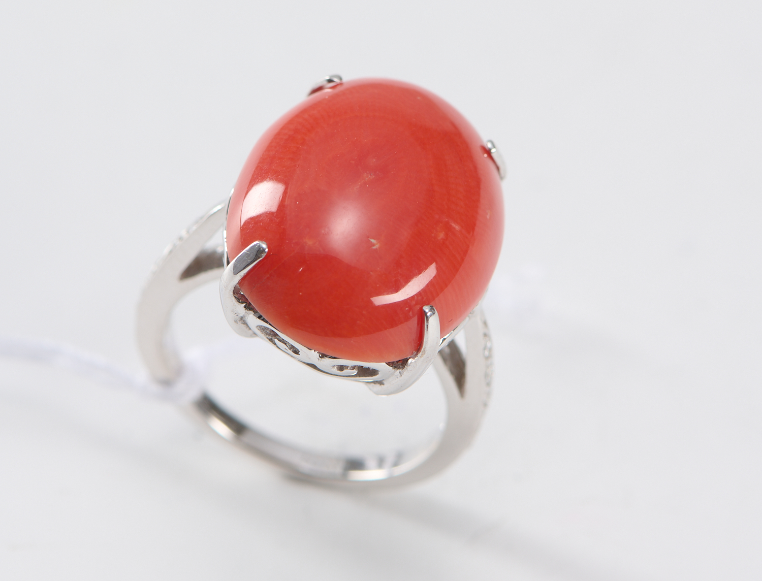 A CORAL AND DIAMOND SET RING IN 18CT WHITE GOLD, THE CORAL WEIGHING APPROXIMATELY 15.40CTS AND MEASURING APPROXIMATELY 20 X 15.6MM WITH DIAMONDS TOTALLING 0.12CTS, APPROXIMATE RING SIZE M, APPROXIMATE WEIGHT 9.81GMS