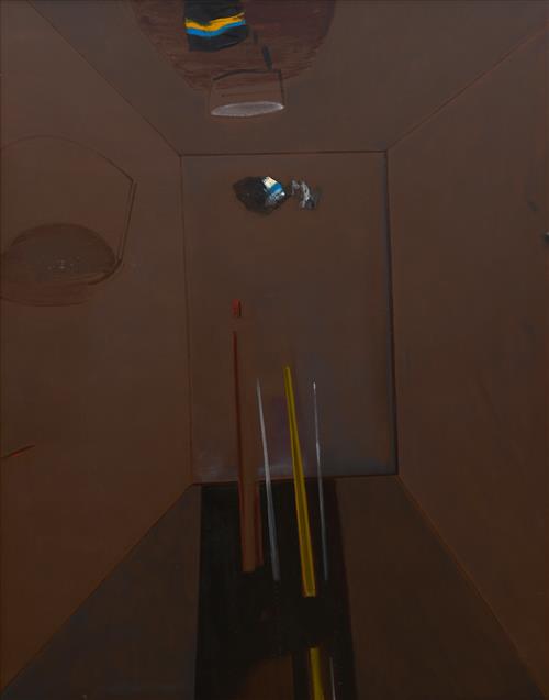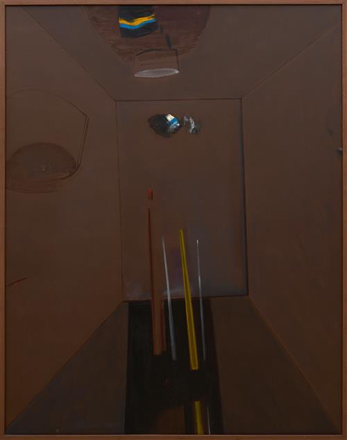 "The painting 'The Alcove' belongs to a group of paintings carried out in 1979. It represents an interior with abstract symbols. I shall give a background to my work - I was brought up in a middle European family during the wartime and its aftermath. I migrated to Australia in 1955 when I was twenty years old. After my formal training in art I was strongly attracted to the mainstream of abstract art. My keen interest in past civilisations and the question of man's existence and purpose on this planet have a constant influence on my work. In the twenty-six years of my being in Australia, the nature; the landscape with its vast distances, the ever-changing skies; the sea and the wild coastlines are the other sources of my inspiration in my paintings, mingled with a strong feeling towards metaphysics"