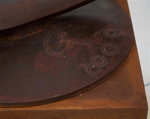 In overall good condition. Natural rust and surface textures to the steel as with age and natural aging of the medium. Plinth measures 90 x 61cm.