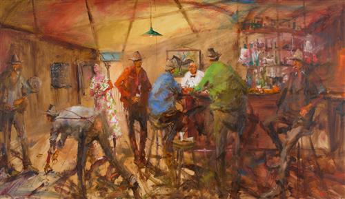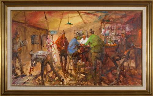Getting the Sale Sheep Ready, Tilbooroo Station, West Queensland (lot 44), Along the Paroo River, West Queensland (lot 45) and A Confidential Moment in the Bar of the Cattle Camp Hotel, Charleville, Queensland (lot 46). The first two depict aspects of the sheep industry and are superb examples of Hugh Sawrey landscapes, displaying his mastery of the essential elements of his oeuvre; including station horses, river gums, out-buildings and mobs of sheep among the dust and atmosphere of working toil. Produced in the early 1980s, these large works demonstrate the refinement of an artist at the height of his career with a sharp attention to detail that states emphatically: 'I saw this.'
