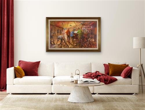 At 32 x 56 inches (82.5 x 143cm), A Confidential Moment is a large work executed on board. But in this instance, when presented with such a broad expanse of 'acreage' Sawrey eschewed detail for gesture. Part of the reason may have been his mood at the time, but then, painting on board, with none of the give of canvas, always gave him an opportunity to work in a far more aggressive manner. It is an approach recalling the earliest days of his professional career and influence of expressionist painter Jon Molvig. Interestingly enough, however, the equine study in the background (a Sawrey within a Sawrey) is well defined. It clearly brackets the two central characters in the narrative and from this interaction we can guess the nature of 'a confidential moment' referred to in his enigmatic title.