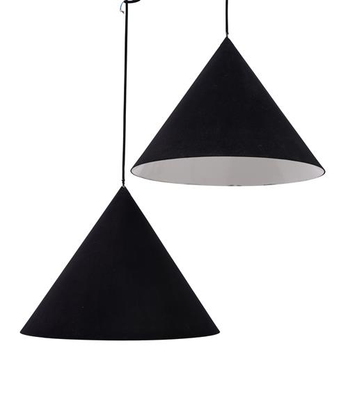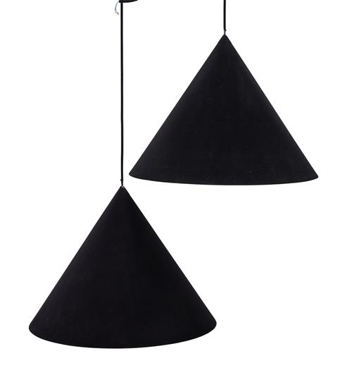 Conical metal shade covered in black velvet including the wire and ceiling caps. White internally.