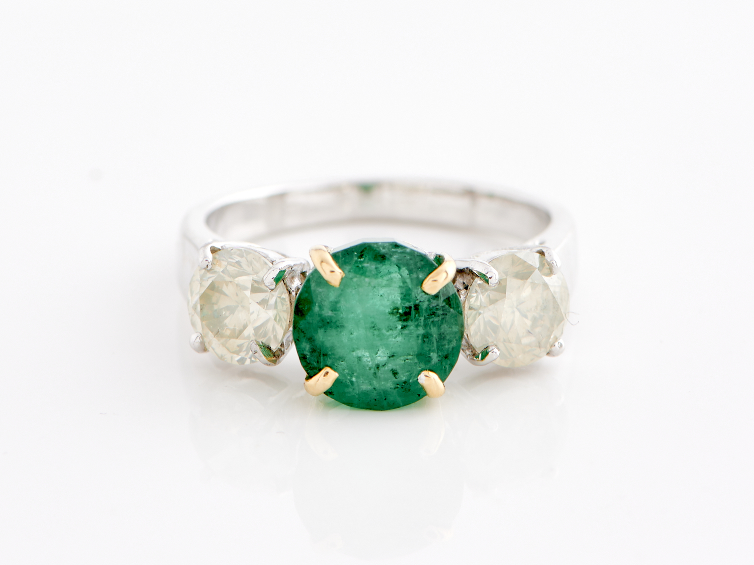 AN EMERALD AND DIAMOND RING IN TWO TONE 18CT WHITE GOLD, THE EMERALD MEASURING 2.70CTS, WITH SHOULDERING DIAMONDS TOTALLING 1.64CTS, RING SIZE M, 4.61GMS