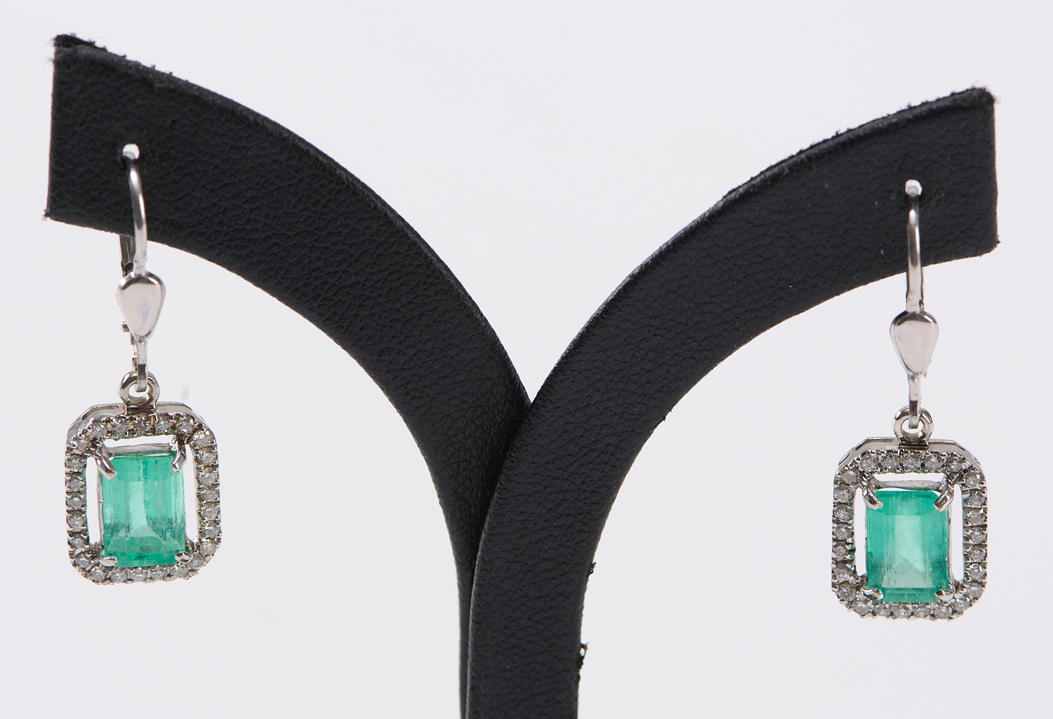 A PAIR OF COLUMBIAN EMERALD AND DIAMOND EARRINGS IN 18CT WHITE GOLD TO POST AND LEVER BACK FITTINGS, THE EMERALDS TOTALLING APPROXIMATELY 3.14CTS, THE DIAMONDS TOTALLING APPROXIMATELY 0.40CTS, LENGTH 30MM, WEIGHT 4.3GMS.