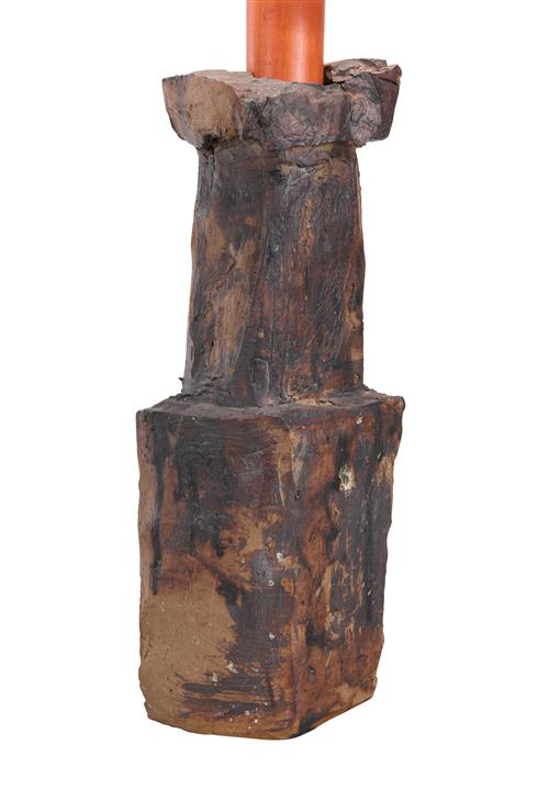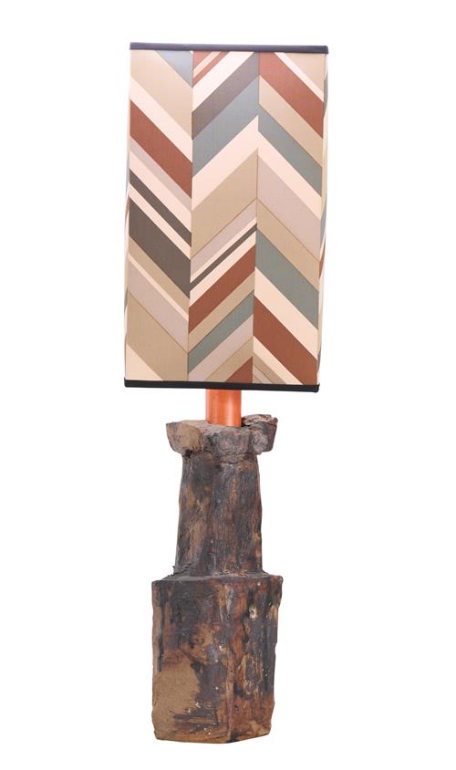 Abstract ceramic base, stained wood with original linen zig-zag pattern.