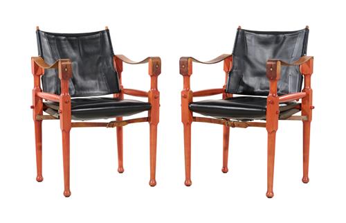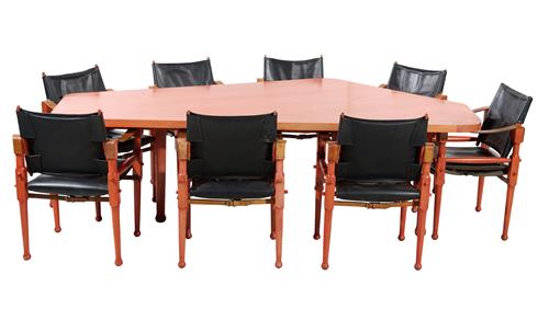 Dining table and eight matching Campaign chairs. Orange stain over New Zealand Tawa, black & brown leather, brass, and plastic chording.