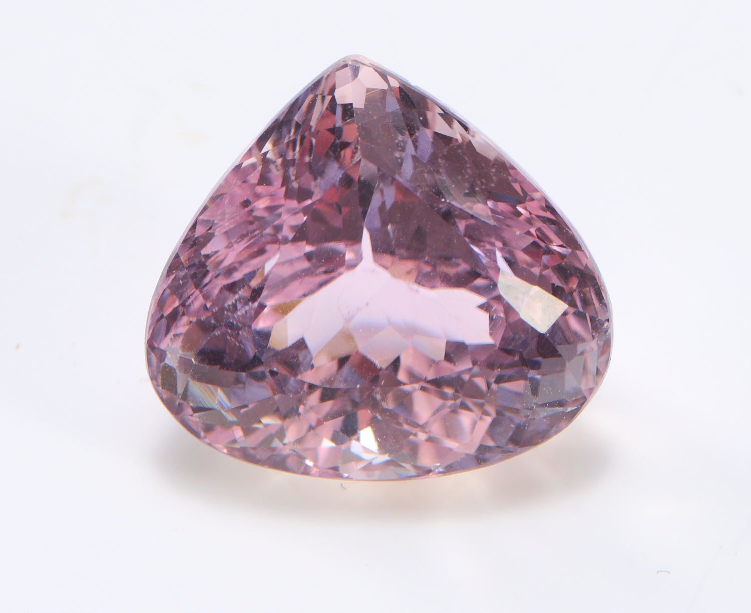 A LOOSE PEAR SHAPED KUNZITE OF LIGHT PINK HUES WEIGHING 27.53CTS, 17.75 X 19.37MM