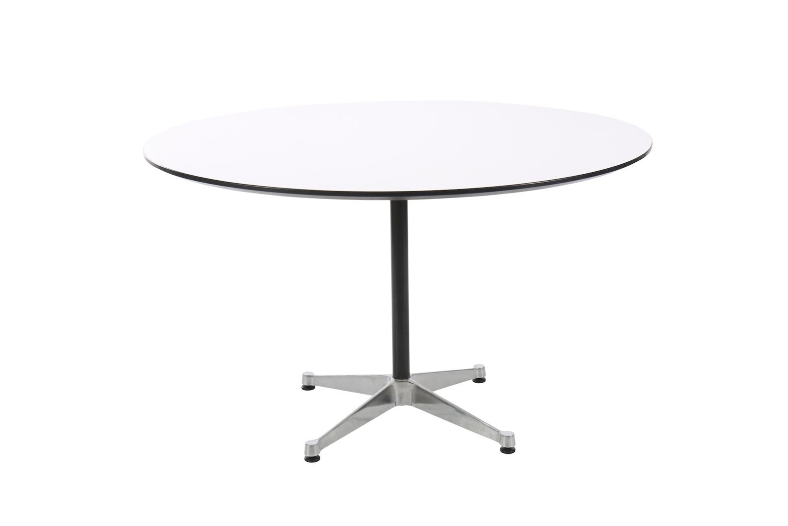Minor signs of age and previous use with marks and surface scratches present to metal, laminate top and plastic edging, all consistent with the age and previous use of the table. A couple of more visible scratches to the white laminate top and some abrasions to the black plastic edging. Very minor patina to aluminium. All parts and present and there are no major losses to the table. Structurally sound and overall in very good condition.
