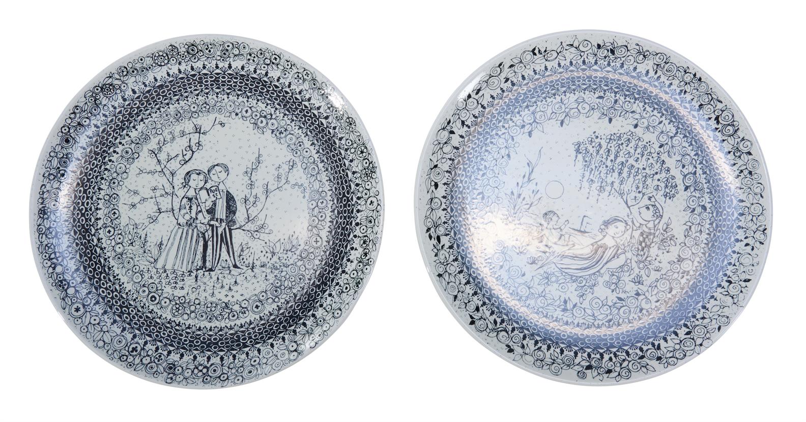 Two plates, one for the season of summer and the other for spring. Ceramic with hand painted season motifs.