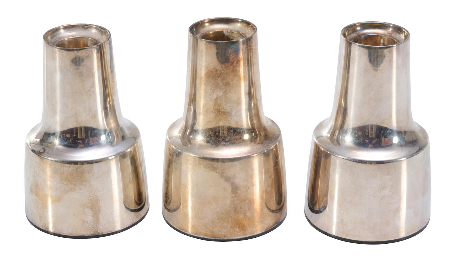 Minor surface scratches and signs of use present to all three of the candle holders. Obvious signs of tarnishing to the silver plating on all of the candle holders. There are no visible dents, cracks, chips or losses to any of the holders. The candle holders are structurally sound and simply need a good clean. Overall in good condition.