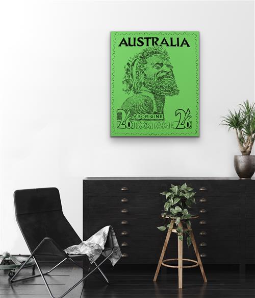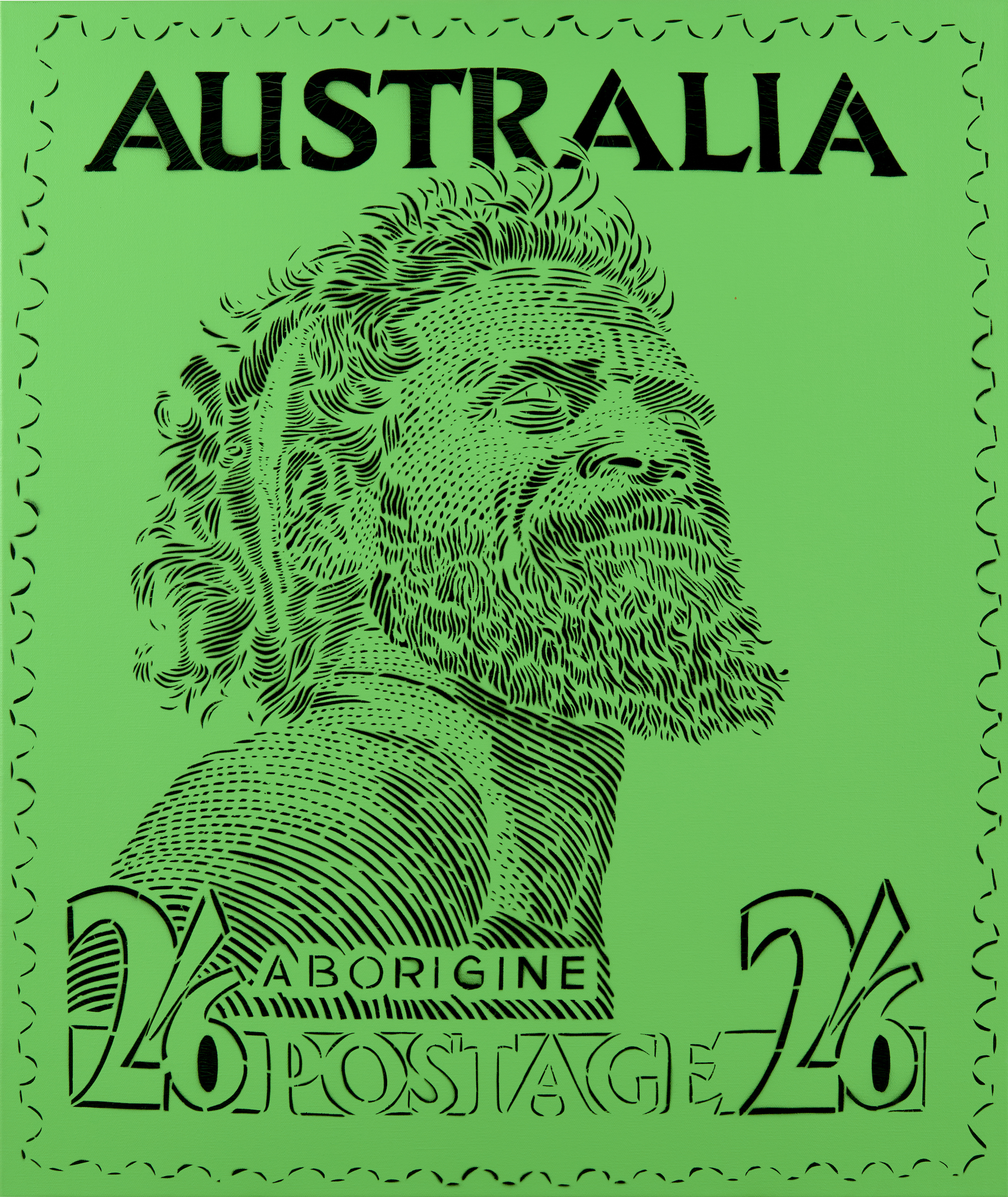 "One of his works, titled Aborigine and made with stencils, was inspired by a stamp from the 1950s, which depicted a traditional Aboriginal man. About 100 million of these stamps were circulated around the world at a time when Aborigines were not recognised as citizens of Australia, he says. "It's such a beautiful image which was exported around the world, advertising this kitschy Australia with its Aboriginal people but at the same time we did not have citizenship."